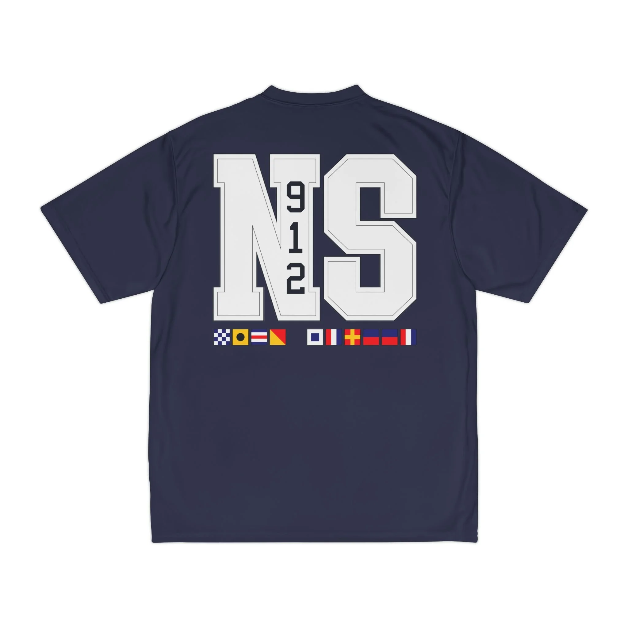 This Performance T-Shirt features the name 'NicoSt' spelled in nautical signs on the front left chest and a big NS with 912 vertical down N representing Savannah, GA on the back. Under that, 'Nico Street' is spelled out in nautical sign. The shirt gives off a cool and casual vibe, perfect for those who love nautical themes or want to represent Savannah, GA. Ideal for everyday wear or for those who enjoy outdoor activities.