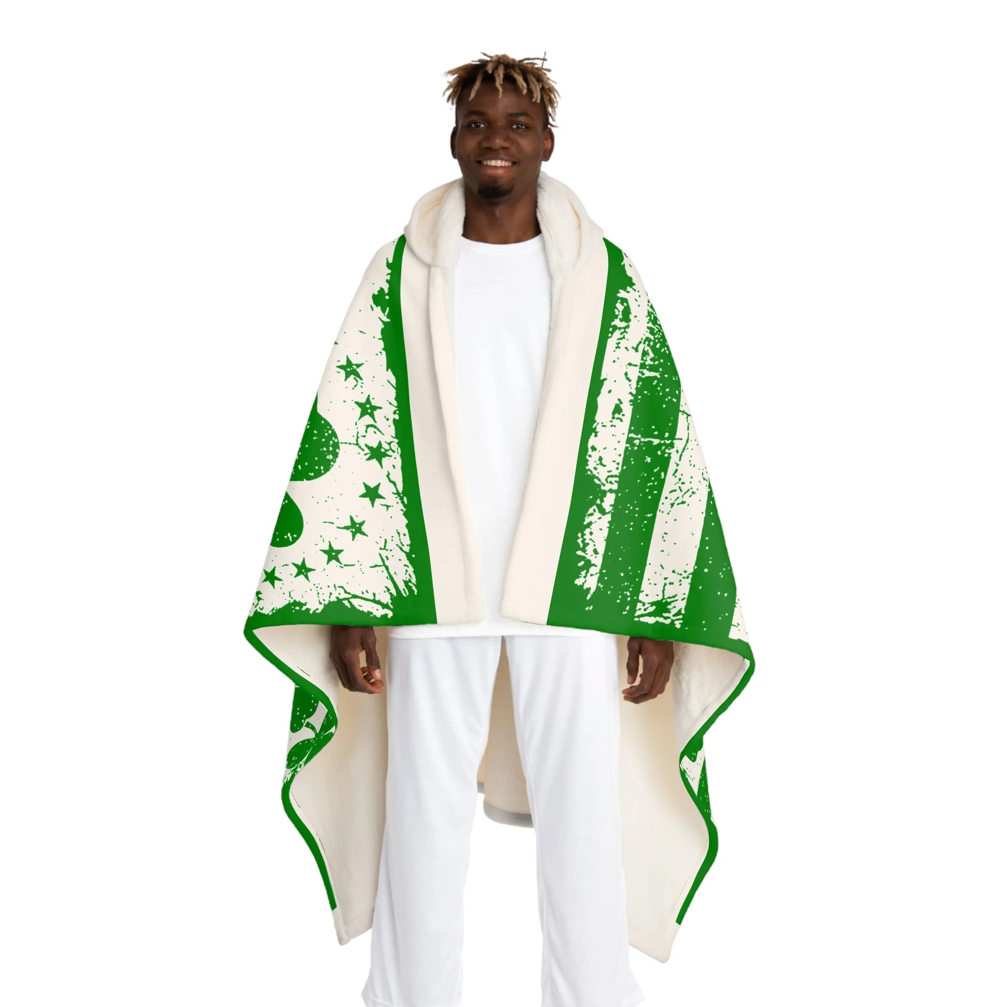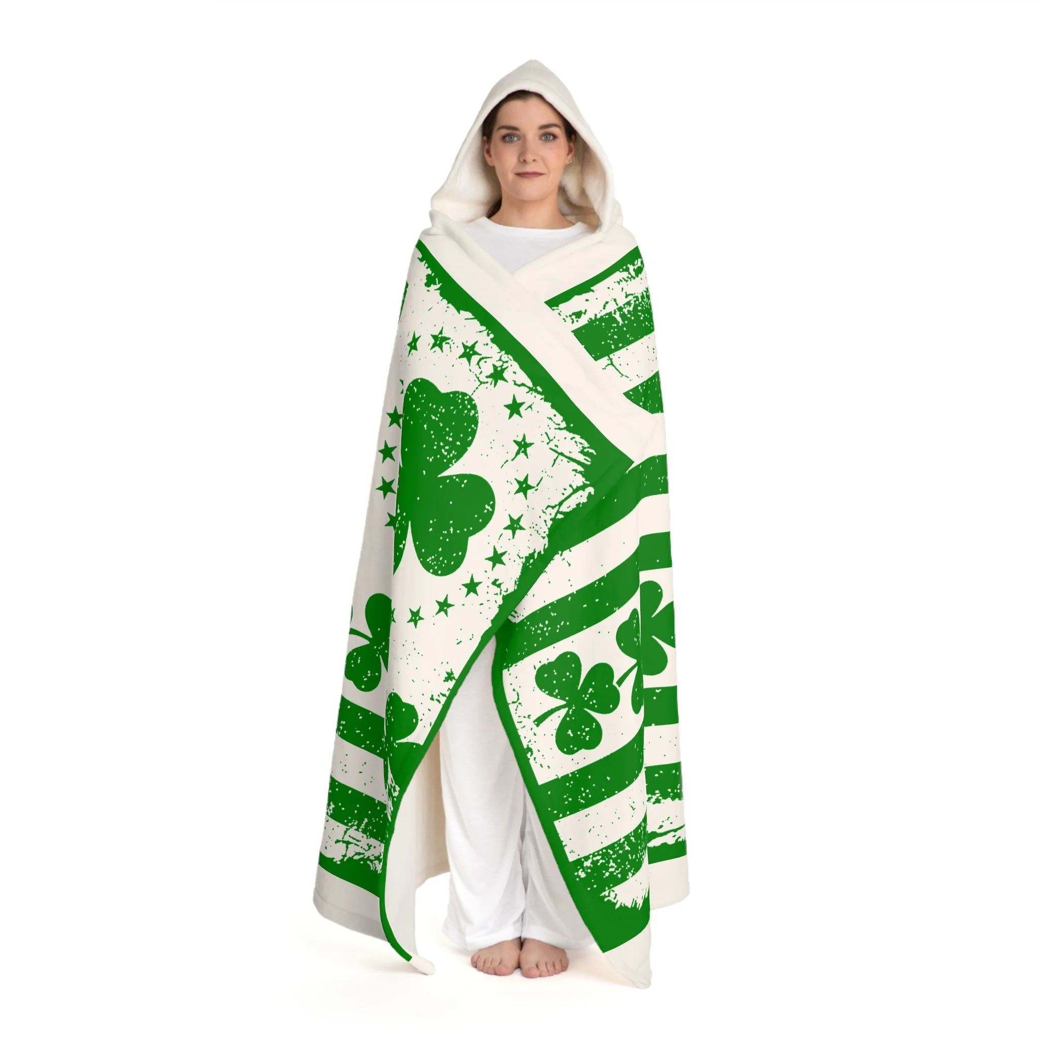 Wrap yourself in a warm, softly worn-in feeling that brings a playful nod to Irish charm. This hooded sherpa fleece blanket blends a plush cream sherpa hood and backing with a bold green distressed print of shamrocks and stripes. It’s the kind of cozy that invites slow mornings, late-night movie marathons, and quiet moments by the window with a hot drink. The generous drape and hood create a snug cocoon without feeling heavy — great for curling up on the couch, layering at outdoor gatherings, or adding a cheerful touch to your stay-in rituals. The worn graphic gives it a lived-in character that pairs well with relaxed weekends and festive St. Patrick’s Day celebrations.